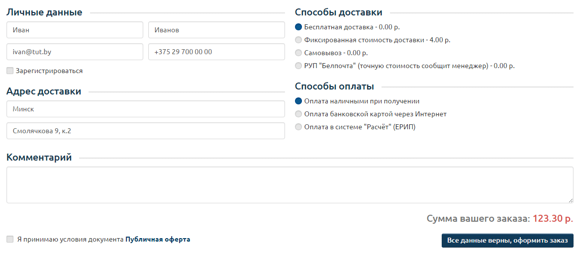 Далее необходимо выбрать способ оплаты. Поставить галочку, принимая условия Публичной оферты. И подтвердить заказ, нажав кнопку "Все данные верны, оформить заказ".